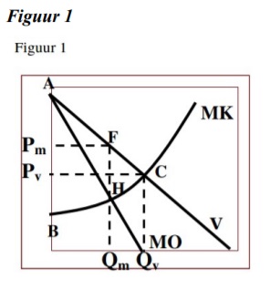 De Europese Commissie heeft in 2007 Heineken, Grolsch en Bavaria voor in totaal 274 miljoen euro aan geldboetes opgelegd, omdat zij bij een kartel op de Nederlandse biermarkt betrokken zijn geweest. Dit kartel is in strijd met de EU-regels die concurrentiebeperkende praktijken van ondernemingen verbieden. In de periode 1996-1999 hielden de brouwerijen talrijke niet-officiële bijeenkomsten, waarop zij prijzen en prijsverhogingen coördineerden. Figuur 1 geeft de vraag (V) naar bier weer op de Nederlandse biermarkt. Ook de marginale-kostencurve (MK) van bierproductie staat in de figuur weergegeven. (Totaal 30 punten)