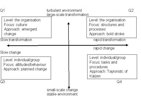 De aard van het veranderingsproces dat vereist is, kan beter begrepen worden door te kijken naar de grootte van de vereiste verandering, de geplande uitkomsten en de organisatorische context van de verandering.